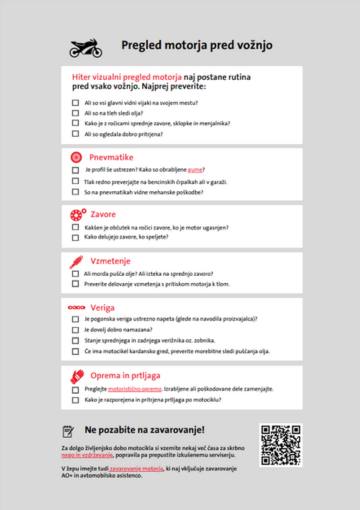 Prenesite seznam, s katerim enostavno preverite, če je vaš motor pripravljen na varno vožnjo. S pomočjo seznama bo pregled ključnih komponent hitro postal rutinski, z njim pa si boste lahko prihranili tudi morebitne nevšečnosti na cesti.